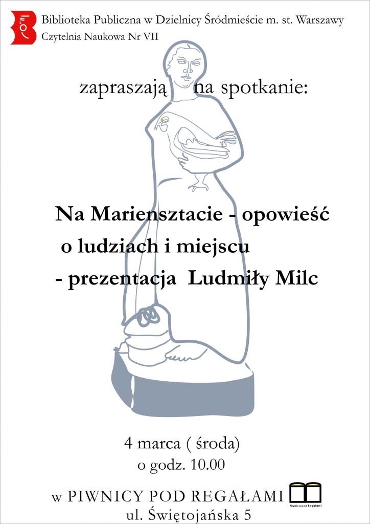 W środę 4 marca o godzinie 10:00 Klub 5+, działający w Czytelni Naukowej Nr VII, ul. Świętojańska 5, zaprasza do „Piwnicy pod Regałami” na prezentację Ludmiły Milc pt. „Na Mariensztacie – opowieść o ludziach i miejscu”.