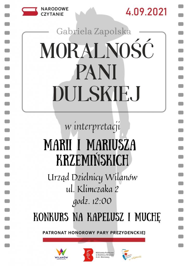 4 września (sobota) o godzinie 12:00 zapraszamy do Urzędu Dzielnicy Wilanów przy ul. Franciszka Klimczaka 2 na Narodowe Czytanie 2021. W świat „Moralności Pani Dulskiej” Gabrieli Zapolskiej wprowadzą nas Mariusz i Maria Krzemińscy. Zachęcamy do włączenia się w akcję. Czytaniu towarzyszyć będzie konkurs na najpiękniejszy kapelusz i muchę z epoki Gabrieli Zapolskiej.