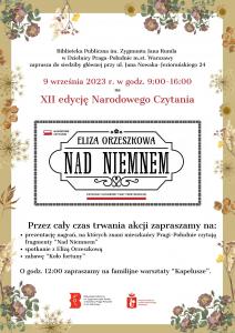 W sobotę 9 września w godz. 9:00-16:00, świętować będziemy XII edycję inicjatywy „Narodowe Czytanie”. Wspólnie będziemy czytać i poznawać „Nad Niemnem” Elizy Orzeszkowej. W siedzibie głównej południowopraskiej biblioteki odbędzie się: