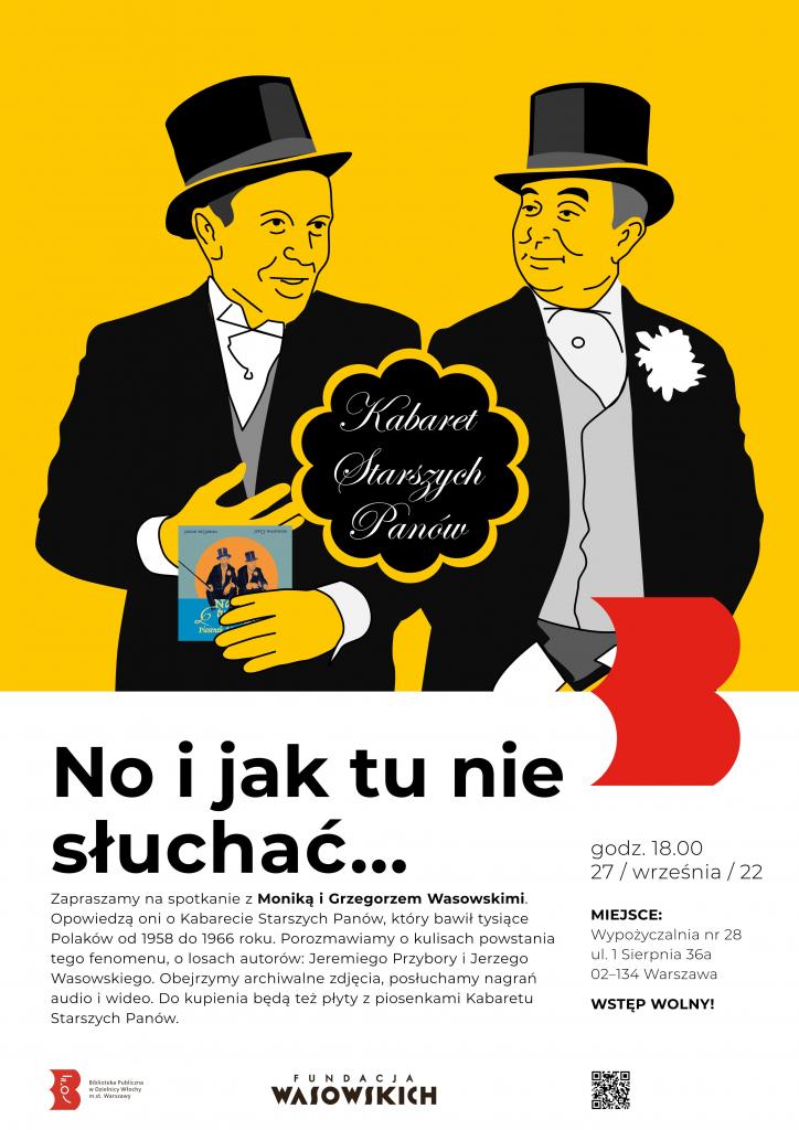 W ramach Włochowskiego Miesiąca Seniora 2022 Wypożyczalnia nr 28 zaprasza we wtorek 27 września 2022 na godz. 18.00 na spotkanie z Moniką i Grzegorzem Wasowskimi. Opowiedzą oni o Kabarecie Starszych Panów, który bawił tysiące Polaków od 1958 do 1966 roku. Porozmawiamy o kulisach powstania tego fenomenu, o losach autorów: Jeremiego Przybory i Jerzego Wasowskiego. Obejrzymy archiwalne zdjęcia, posłuchamy nagrań audio i wideo. Do kupienia będą też płyty z piosenkami Kabaretu Starszych Panów. Wstęp wolny!