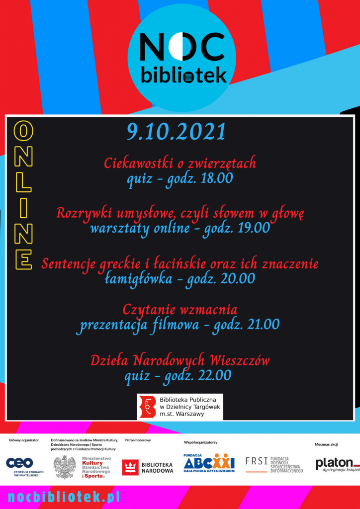 „Czytanie wzmacnia” – to hasło tegorocznej Nocy Bibliotek. Biblioteka Publiczna na Targówku organizuje następujące działania stacjonarne i online: