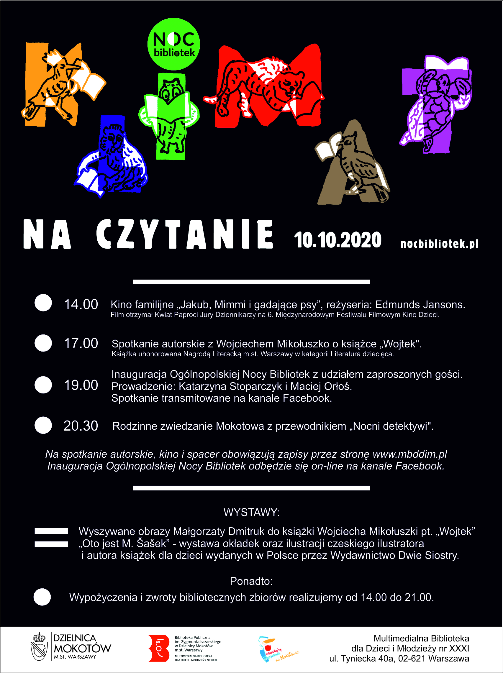 Zapraszamy na VI wydanie ogólnopolskiej akcji Noc Bibliotek w sobotę 10 października 2020 r. Tegoroczna Noc odbędzie się pod hasłem „Klimat na czytanie”. W Multimedialnej Bibliotece dla Dzieci i Młodzieży nr XXXI będziemy obecni w godz. 14.00 – 21.00. Wśród aktywności, które będą miały miejsce na Tynieckiej odbędzie się Inauguracja Ogólnopolskiej Nocy Bibliotek!