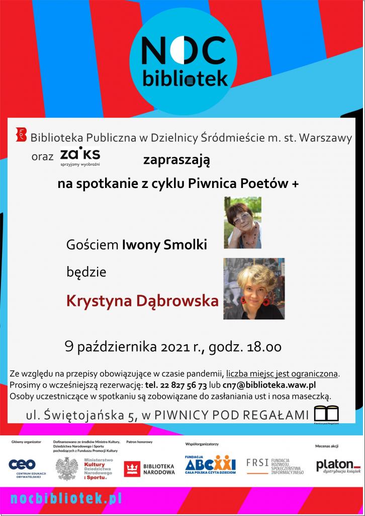 W ramach Nocy Bibliotek, 9 października (sobota) o godzinie 18:00 w „Piwnicy pod Regałami”, ul. Świętojańska 5, odbędzie się spotkanie z cyklu „Piwnica Poetów+”. Gościem Iwony Smolki będzie Krystyna Dąbrowska – polska poetka, eseistka, tłumaczka z angielskiego.