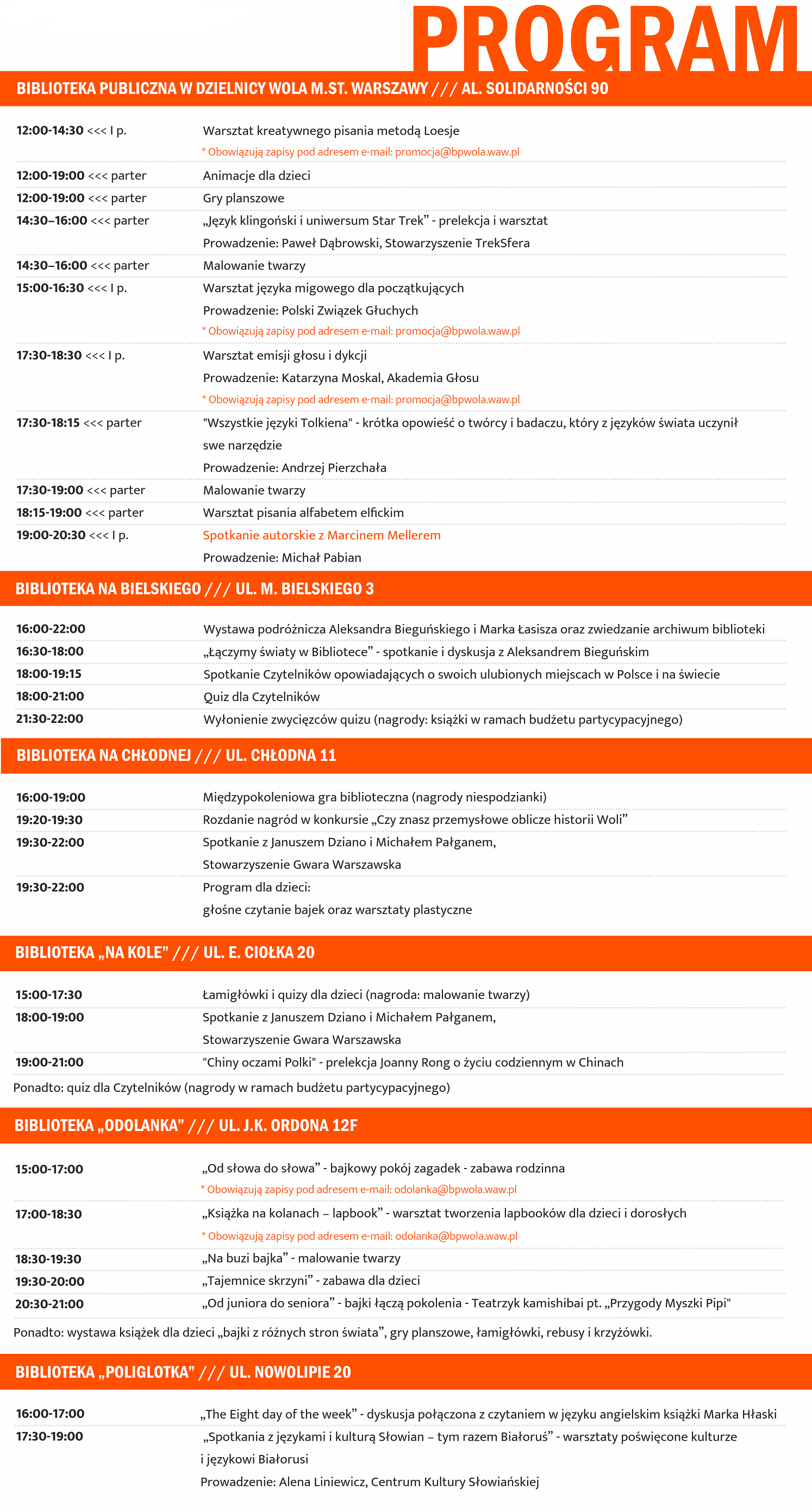 Centralne obchody wolskiej Nocy Bibliotek odbędą się w Bibliotece przy al. Solidarności 90. Będziemy wspólnie szukać różnych form komunikacji, przyglądać się różnym językom (także tak egzotycznym jak język elficki), rozwijać kreatywność na warsztatach i świetnie bawić się w gronie dużych i małych miłośników czytania.