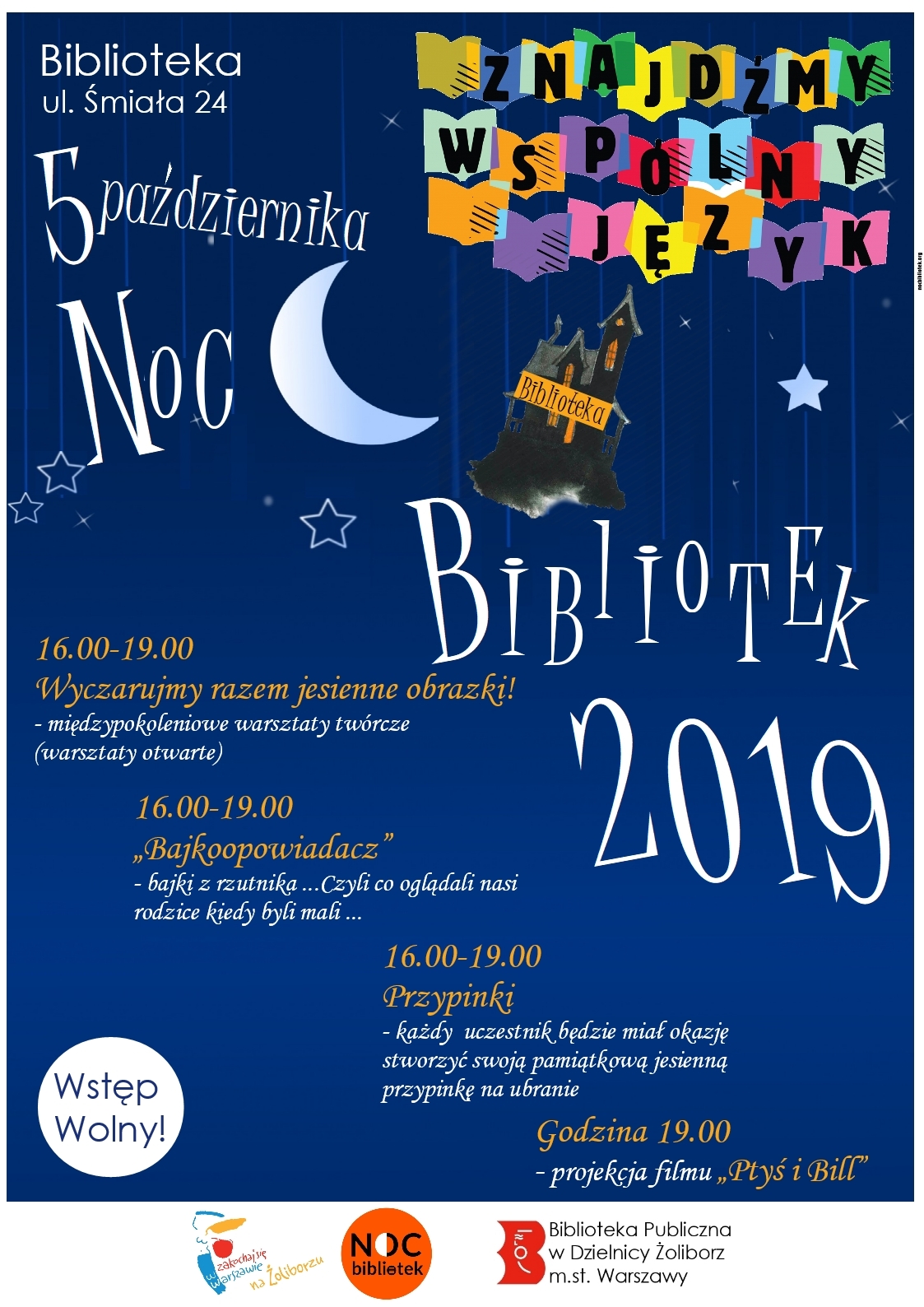 Noc Bibliotek to wielkie święto bibliotek i czytania – ogólnopolska akcja w niekonwencjonalny sposób, zachęcająca do korzystania z zasobów bibliotek, jako najbardziej otwartych i dostępnych instytucji kultury z ofertą dla osób w każdym wieku, miejsc wspólnych, łączących ludzi, lokalnych centrów żywej kultury i edukacji. W bibliotekach w całej Polsce 5 października (sobota), czekają na czytelników specjalne wydarzenia – niecodzienne spotkania z literaturą i filmem. Zapraszamy na żoliborską edycję tego wielkiego święta do naszej placówki przy ul. Śmiałej: