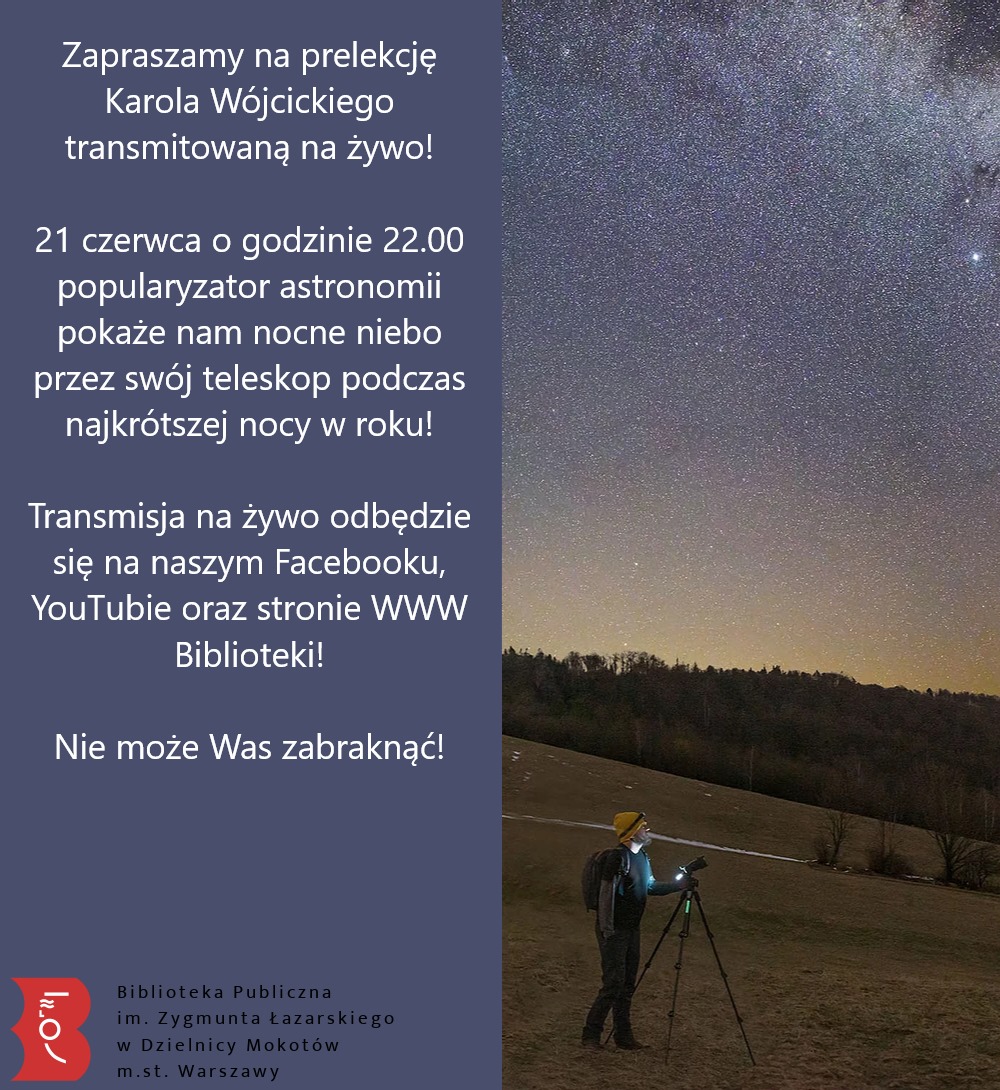 Serdecznie zapraszamy na pokaz nocnego nieba wraz z prelekcją podczas najkrótszej nocy w roku!