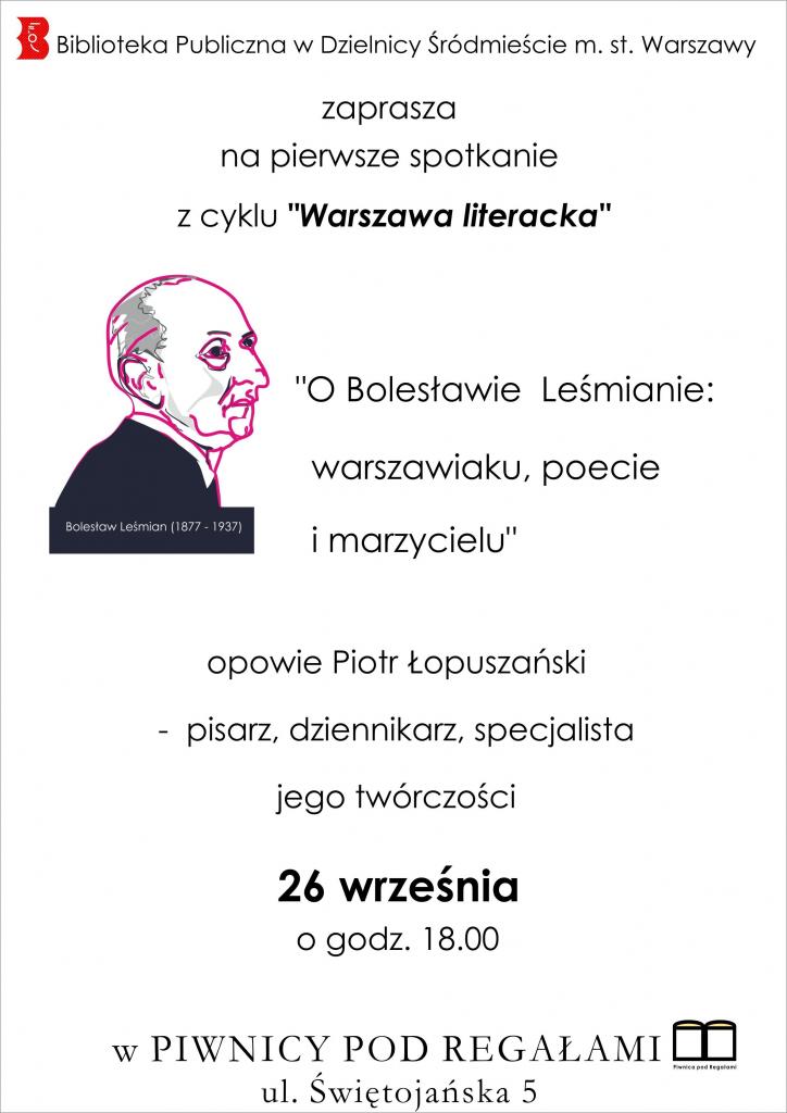 „O Bolesławie Leśmianie: warszawiaku, poecie i marzycielu” opowie Piotr Łopuszański – pisarz, dziennikarz, specjalista jego twórczości. Spotkanie odbędzie się 26 września o godzinie 18:00 w Piwnicy pod Regałami przy ul. Świętojańskiej 5.