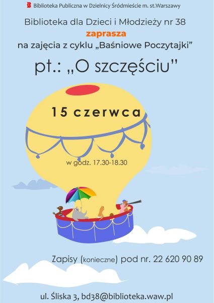 W czwartek 15 czerwca o godzinie 17:30 zapraszamy do Biblioteki dla Dzieci i Młodzieży nr 38 przy ulicy Śliskiej 3 na Baśniowe Poczytajki pt.: „O szczęściu”.