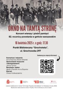 Z okazji 82. rocznicy wybuchu Powstania w Getcie Warszawskim zapraszamy na wyjątkowy koncert poezji i pieśni poświęcony pamięci bohaterów tamtych wydarzeń pt. „Okno na tamtą stronę”, który odbędzie się w środę 16 kwietnia o godz. 17:30 w Punkcie bibliotecznym „Grochoteka”, ul. Grochowska 297.
