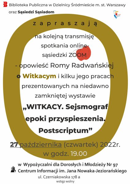 Biblioteka Publiczna w Dzielnicy Śródmieście m.st. Warszawy oraz Sąsiedzi Sąsiadom zapraszają do Wypożyczalni dla Dorosłych i Młodzieży nr 97 i Centrum Informacji im. Jana Nowaka-Jeziorańskiego przy ul. Czerniakowskiej 178a na transmisję spotkania online sąsiedzki Zoom – opowieść Romy Radwańskiej o Witkacym i kilku jego pracach prezentowanych na wystawie „Witkacy. Sejsmograf epoki przyspieszenia. Postscriptum”.