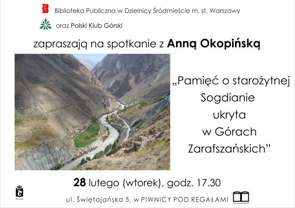 W dniu 28 lutego o godzinie 17:30 w „Piwnicy pod Regałami” odbędzie się prelekcja pt. „Pamięć o starożytnej Sogdianie ukryta w Górach Zarafszańskich” – o tej niezwykłej krainie i jej mieszkańcach opowie Anna Okopińska.