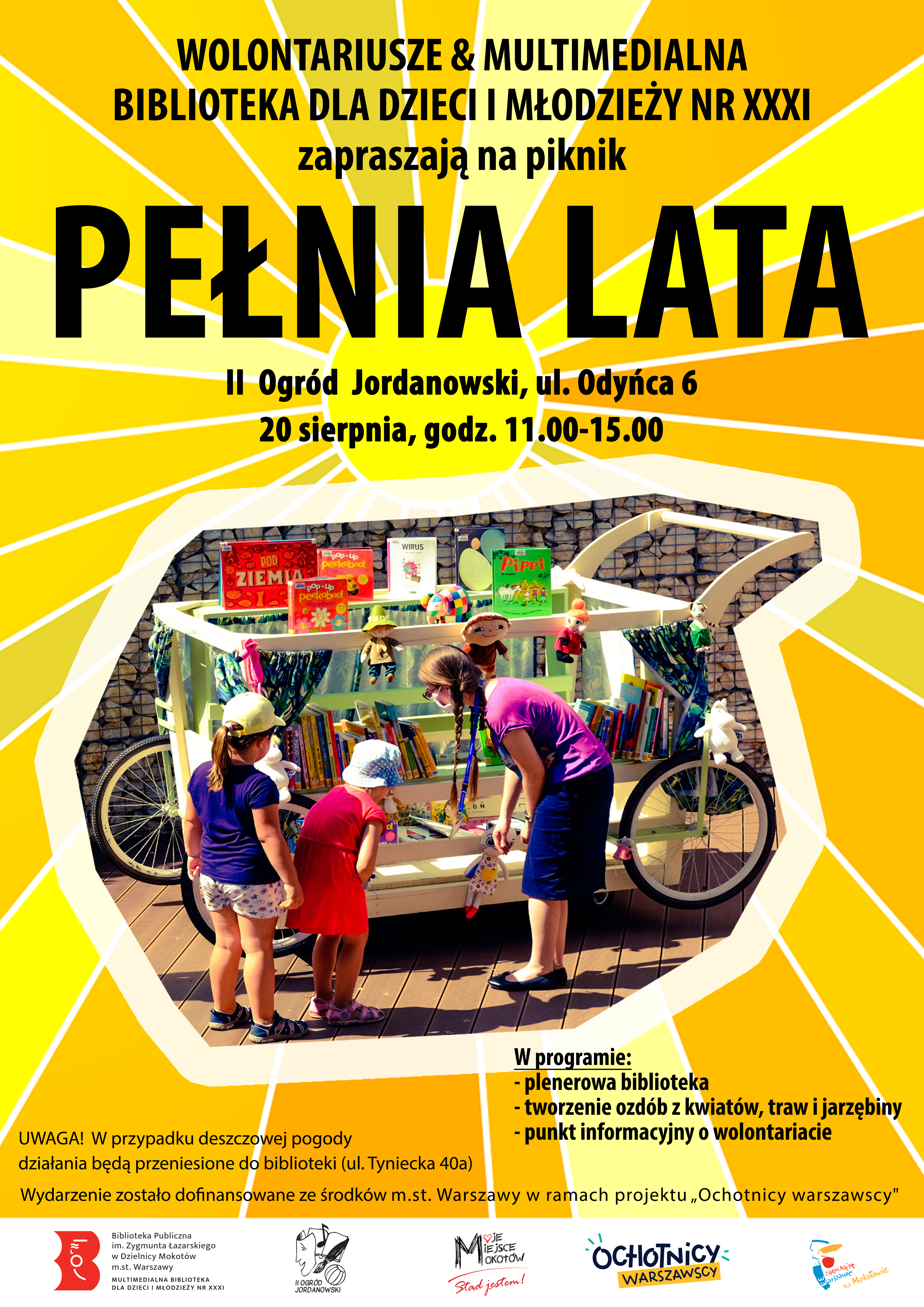 Wolontariusze i Multimedialna Biblioteka dla Dzieci i Młodzieży nr XXXI zapraszają na piknik „Pełnia lata”.