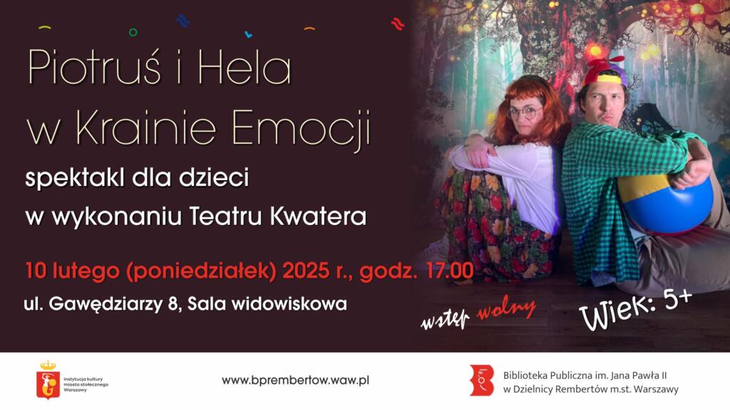Magiczna podróż po świecie emocji rozpocznie się w bibliotece! Spektakl dla dzieci „Piotruś i Hela w Krainie Emocji” w wykonaniu Teatru Kwatera odbędzie się w bibliotece przy ul. Gawędziarzy 8, w poniedziałek 10 lutego o godz. 17:00.