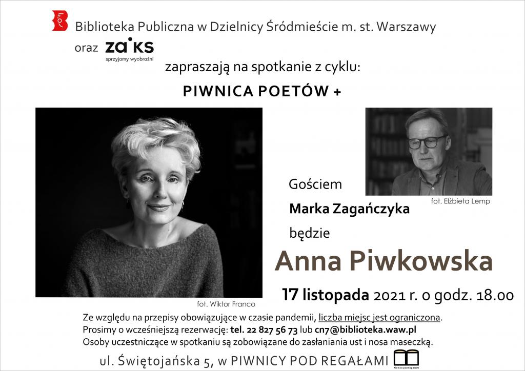 W środę, 17 listopada o godzinie 18:00 w „Piwnicy pod Regałami” odbędzie się spotkanie z cyklu „Piwnica Poetów+”. Gościem Marka Zagańczyka będzie Anna Piwkowska.