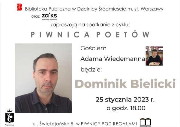 Gościem Adama Wiedemanna będzie Dominik Bielicki. Zapraszamy do Piwnicy pod Regałami przy ul. Świętojańskiej 5.