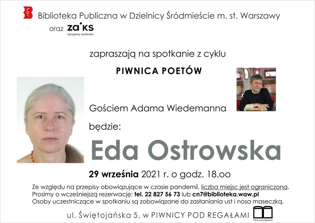 W środę 29 września o godzinie 18:00 w „Piwnicy pod Regałami” przy ul. Świętojańskiej 5, odbędzie się spotkanie z cyklu „Piwnica Poetów”. Gościem Adama Wiedemanna będzie Eda Ostrowska.