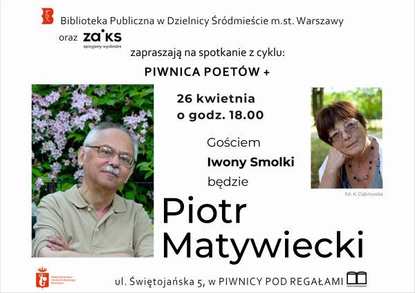 W dniu 26 kwietnia o godzinie 18:00 w „Piwnicy pod Regałami” przy ul. Świętojańskiej 5 odbędzie się spotkanie z cyklu „Piwnica Poetów+”.