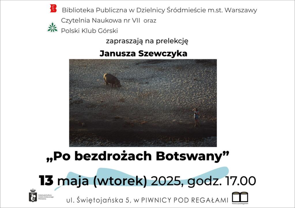 Czytelnia Naukowa Nr VII oraz Polski Klub Górski zapraszają 13 maja o godzinie 17:00 na prelekcję Janusza Szewczyka pt. „Po bezdrożach Botswany”.