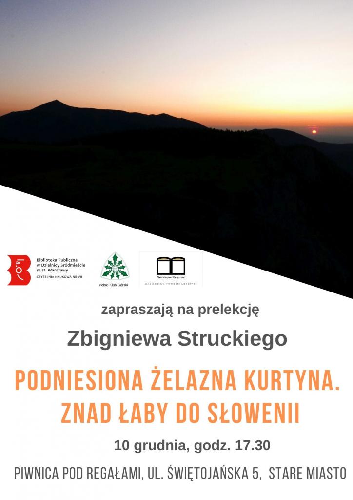 Zapraszamy we wtorek 10 grudnia o godzinie 17:30 do „Piwnicy pod Regałami”, gdzie odbędzie się prelekcja Zbigniewa Struckiego pt. „Podniesiona żelazna kurtyna. Znad Łaby do Słowenii”.