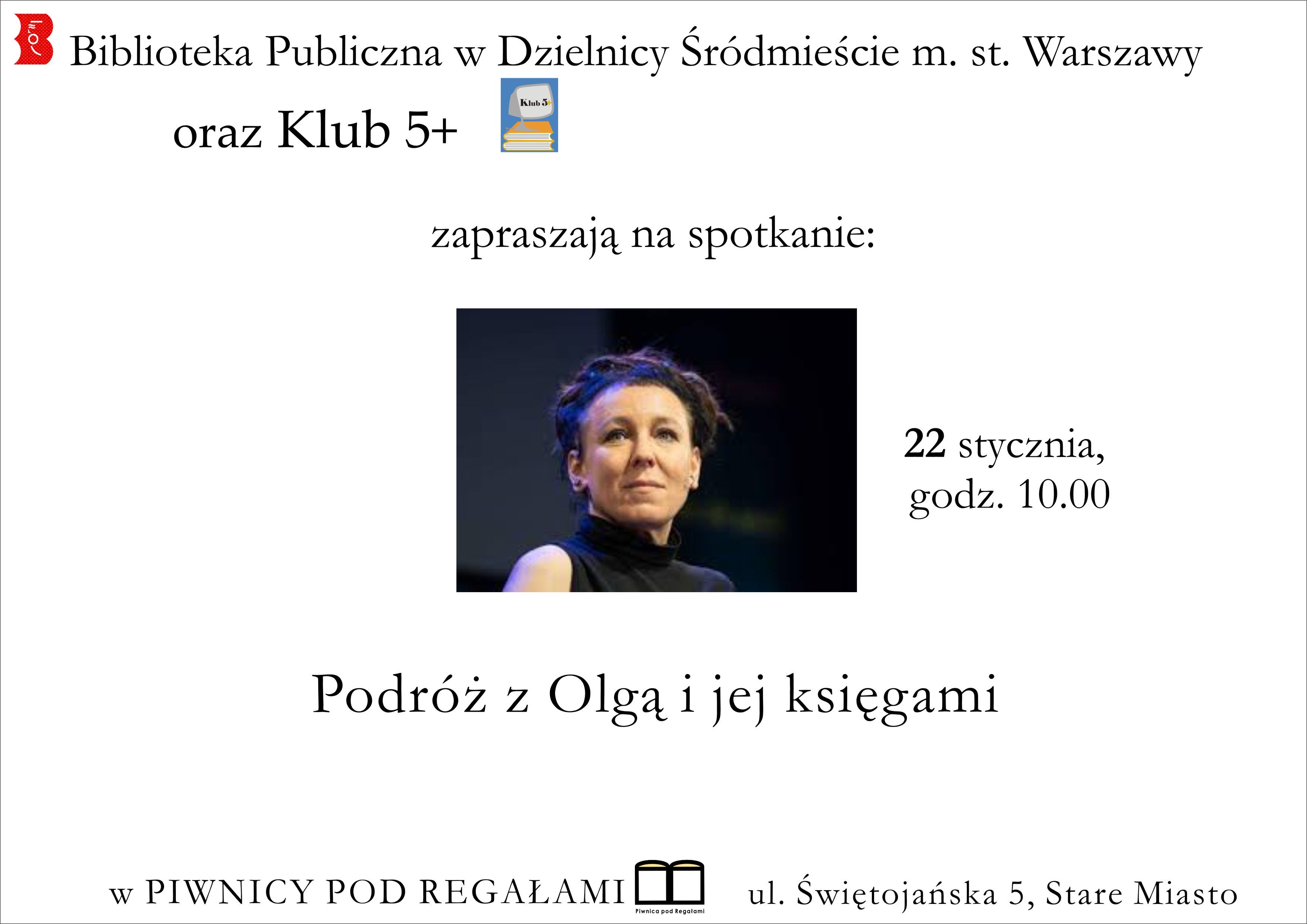 Biblioteka Publiczna w Dzielnicy Śródmieście m.st. Warszawy oraz Klub 5+ zapraszają na spotkanie poświęcone naszej noblistce Oldze Tokarczuk, pt. „Podróż z Olgą i jej księgami”.