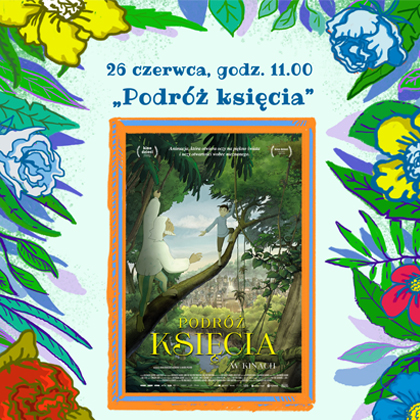 Wydarzenie finansowane jest ze środków pochodzących z Budżetu Obywatelskiego 2021 w ramach projektu „Biblioteka z ogrodem zamiast betonu, otwarta w weekendy, rozkWita na Tynieckiej – bezpłatne koncerty, filmy, nowości wydawnicze, warsztaty, kawa, hamaki i źródełko wśród kwiatów”. Na górze tekst: „26 czerwca, godz. 11.00, „Podróż ksiÄ™cia". W Å›rodku ramka, a w niej bohaterowie filmu: mÅ‚ody chÅ‚opiec i starszy mężczyzna. W tle na górze i po bokach motywy kwiatowe.