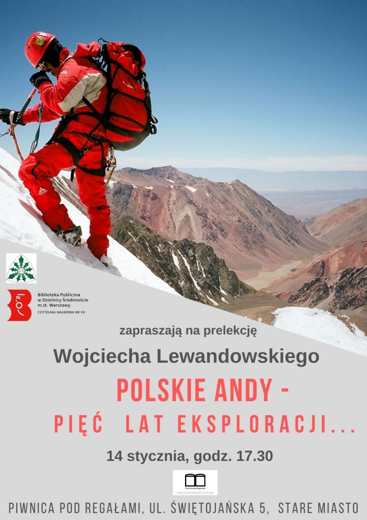Polskie Andy – pięć lat eksploracji…. prelekcja podróżnicza dr Wojciecha Lewandowskiego z Wydziału Geografii i Studiów Regionalnych Uniwersytetu Warszawskiego, geografa (geoekologa), znawcę Andów i Ameryki Południowej. Opowieść o pięciu wyprawach w Andy zorganizowanych w latach 2005-2013 śladami polskich pionierskich ekspedycji górskich z lat 30. XX wieku, o magicznej więzi z chłopakami z tamtych lat i marzeniach, które się spełniają. Każda z wypraw była przygodą na najwyższych szczytach Ameryki Południowej. Ich bohaterami byli uczestnicy wypraw i góry Aconcagua, Mercedario, Cerro Ramada, Ojos de Salado, Tres Cruses oraz inne piękne i dumne szczyty, które na początku były wyzwaniem, a potem stały się miłością życia. Jest to też opowieść o ogromnej fascynacji Andami, nieokiełznanymi górami, gdzie hula dziki wiatr viento blanco, na powietrznych prądach szybują kondory, a po zboczach wędrują stada wigoni i gwanaco. I w końcu to historia przyjaźni, radości odkrywania i wędrówki przez pustynie i penitenty, wędrówki w stronę gór.