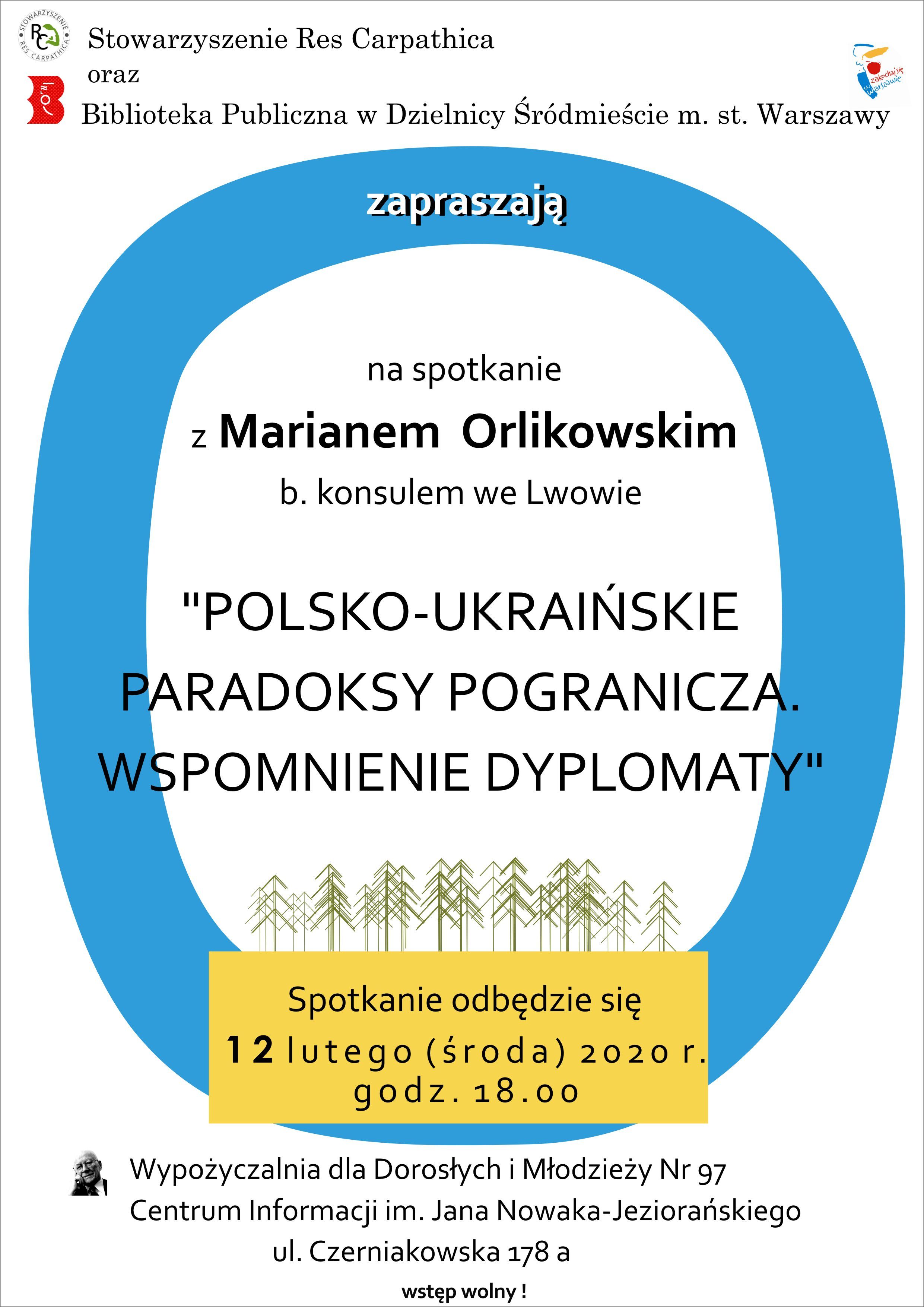 Stowarzyszenie Res Carpathica oraz Biblioteka Publiczna w Dzielnicy Śródmieście m.st. Warszawy, zapraszają w środę 12 lutego o godzinie 18:00 do Wypożyczalni dla Dorosłych i Młodzieży nr 97 przy ulicy Czerniakowskiej 178A na spotkanie z Marianem Orlikowskim, b. konsulem we Lwowie. Temat spotkania to „Polsko-ukraińskie paradoksy pogranicza. Wspomnienie dyplomaty”.