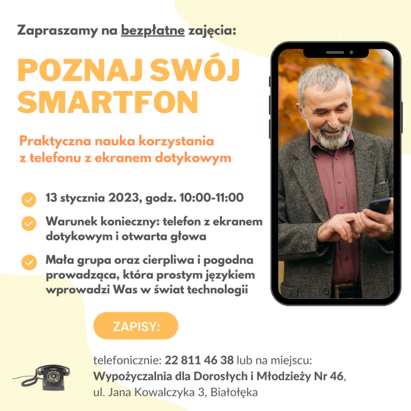 Wypożyczalnia Nr 46 przy ul. Kowalczyka 3 zaprasza na praktyczną naukę korzystania z telefonu z ekranem dotykowym. Warsztaty odbędą się dnia 13.01.2023 r. (piątek) godz. 10.00.