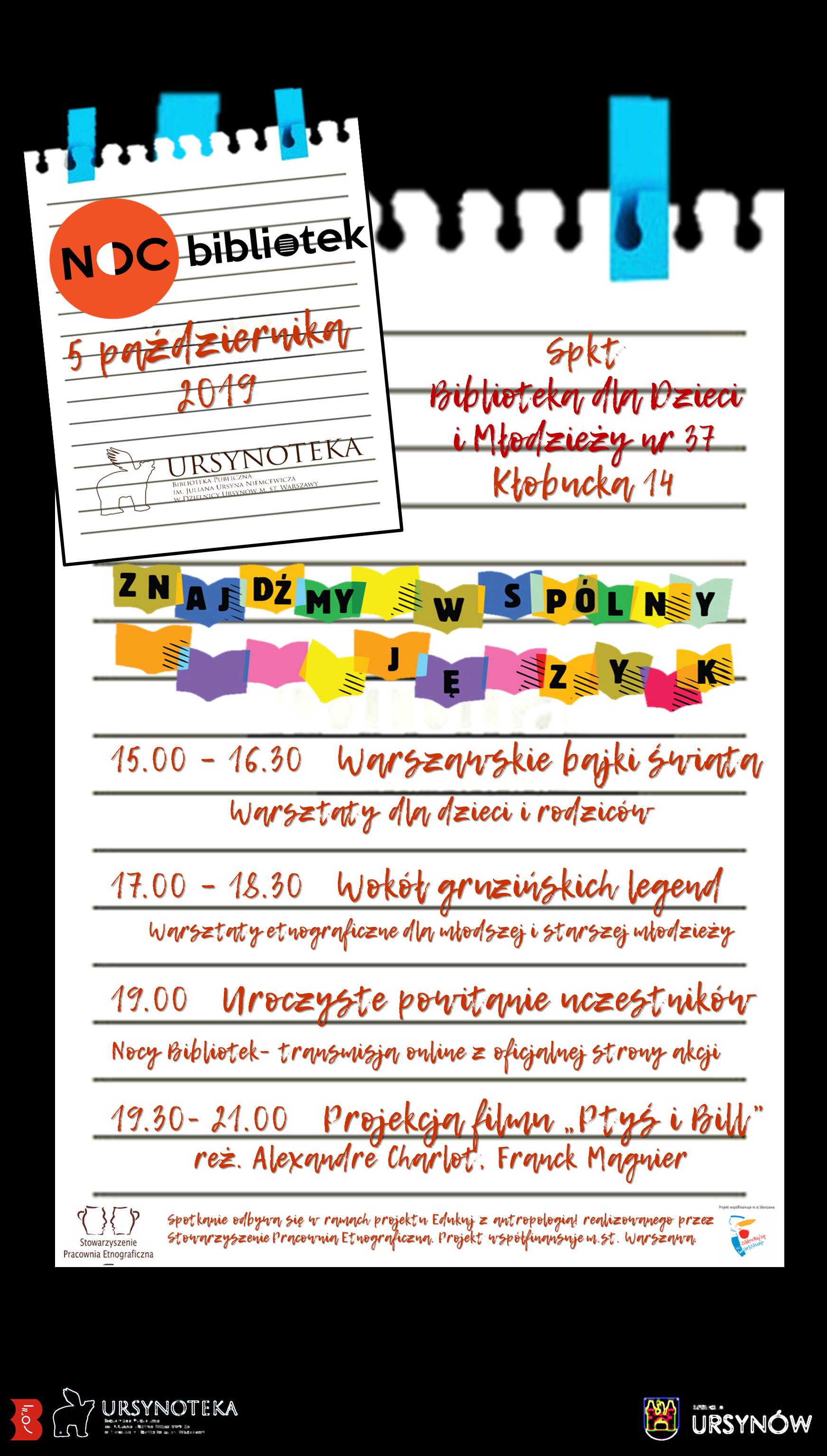 Zapraszamy do Biblioteki dla Dzieci i Młodzieży Nr 37 na ul. Kłobuckiej 14 od godz.15:00 do 21:00 na V edycję Nocy Bibliotek pod hasłem „Znajdźmy wspólny język”.