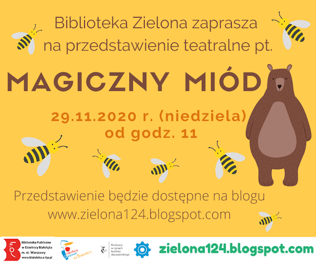 Serdecznie zapraszamy 29 listopada (niedziela) na przedstawienie teatralne dla dzieci pt. „Magiczny miód„. Link do przedstawienia dostępny będzie od godz. 11 przez dobę na naszym blogu.