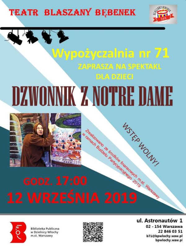 Wypożyczalnia nr 71 gorąco zaprasza na przedstawienie w wykonaniu Teatru Blaszany Bębenek, podczas którego wspólnie obejrzymy historię zatytułowaną “Dzwonnik z Notre Dame”.