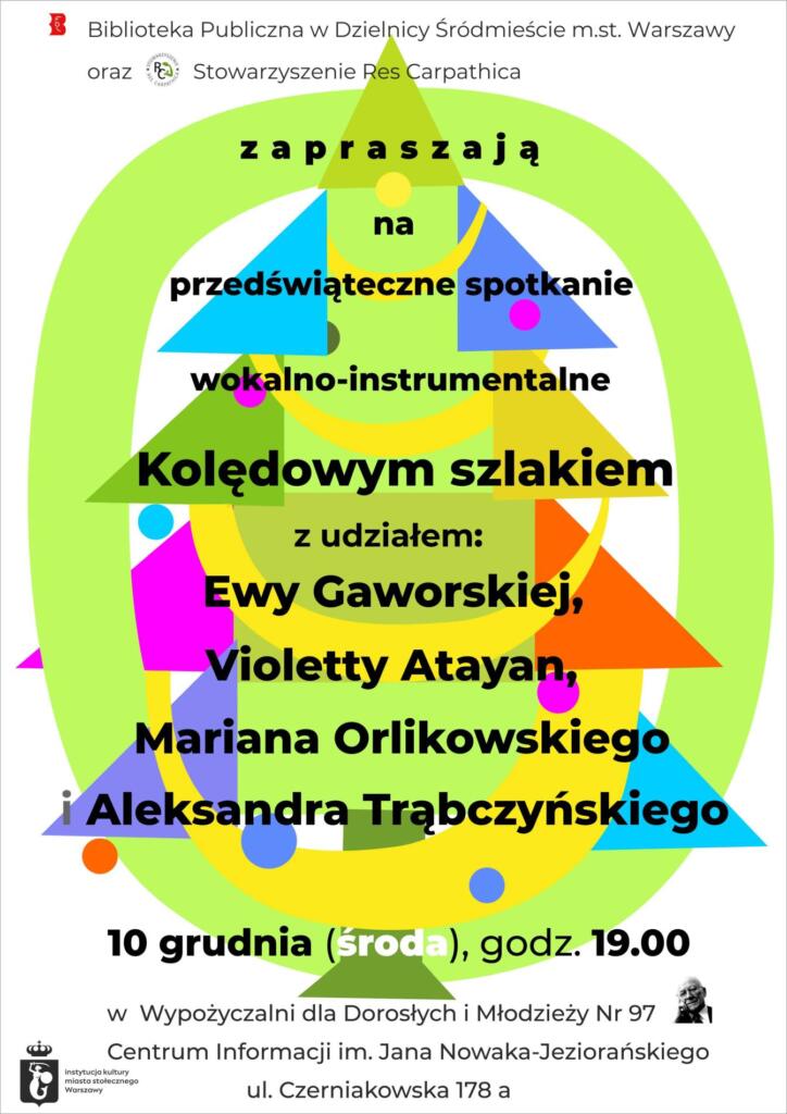 Biblioteka Publiczna w Dzielnicy Śródmieście m.st. Warszawy oraz Stowarzyszenie Res Carpathica zapraszają na przedświąteczne spotkanie wokalno-instrumentalne z udziałem: Ewy Gaworskiej, Violetty Atayan, Mariana Orlikowskiego i Aleksandra Trąbczyńskiego.