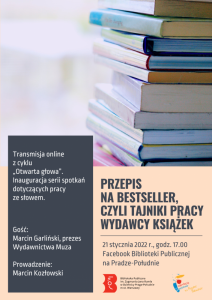 Sukces cyklu spotkań „Otwarta głowa” zachęcił nas, pracowników Biblioteki Publicznej im. Zygmunta Jana Rumla w Dzielnicy Praga-Południe, do organizowania go również w 2022 roku. Tym razem proponujemy Państwu spotkania z interesującymi osobami, których życie prywatne oraz zawodowe związane jest ze słowem. Na pierwszym spotkaniu, które poprowadzi dziennikarz Marcin Kozłowski, poznamy tajniki wydawcy, które przybliży Marcin Garliński, prezes wydawnictwa Muza. Na spotkanie online zapraszamy 21 stycznia 2022 r. o godz. 17:00. Transmisja dostępna będzie na profilu facebookowym – www.facebook.com/Biblioteka.Praga.Poludnie. Zapraszamy.