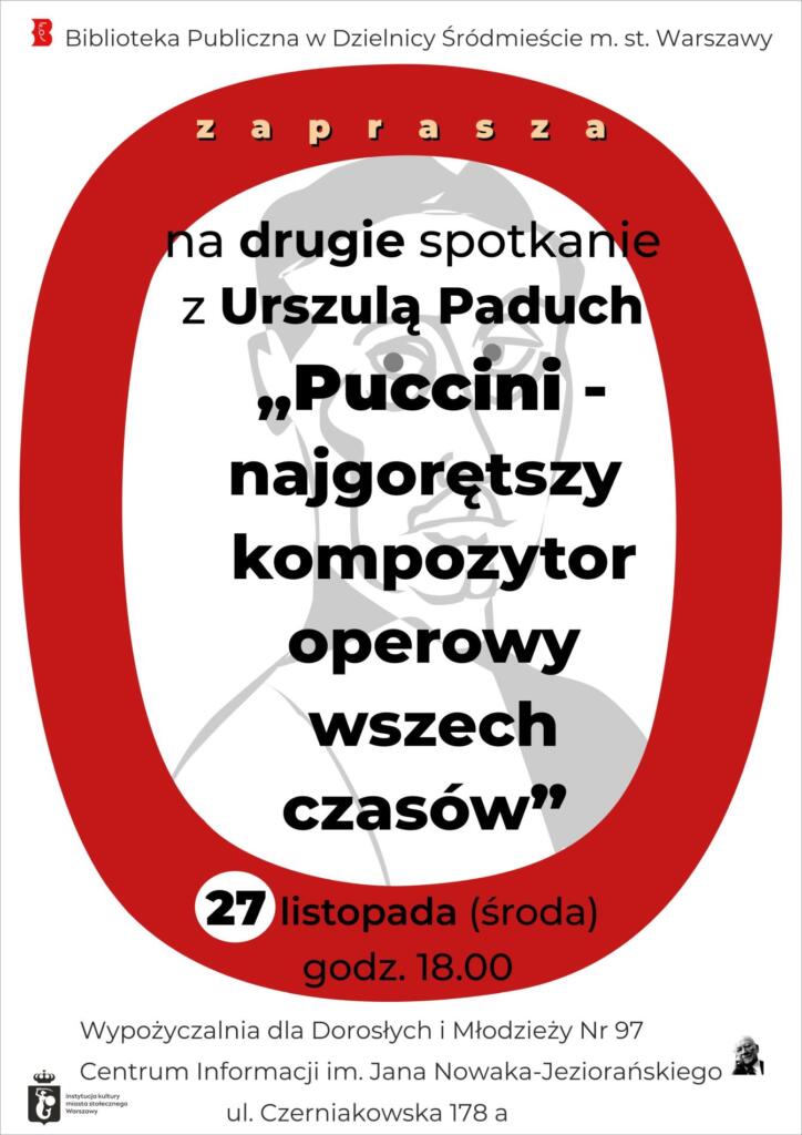 Biblioteka Publiczna w Dzielnicy Śródmieście m.st. Warszawy zaprasza na drugie spotkanie z Urszulą Paduch pt. „Puccini – najgorętszy kompozytor operowy wszech czasów”.