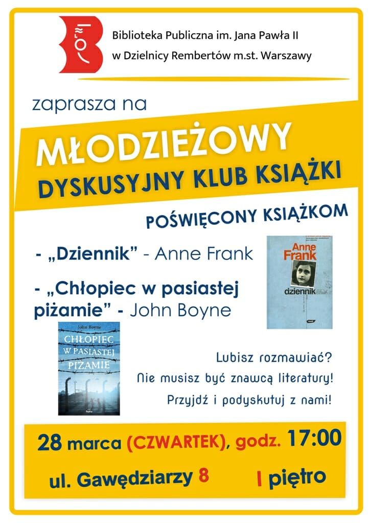 Biblioteka Publiczna w Dzielnicy Rembertów m.st. Warszawy zaprasza na marcowe spotkanie Młodzieżowego Dyskusyjnego Klubu Książki.