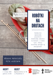 Zapraszamy zarówno wieloletnich miłośników robótek, jak i osoby, które chciałyby się tej sztuki nauczyć. Spotkanie odbędzie się 4 lutego o godzinie 13:00 w Filii nr 78 przy ul. Majdańskiej 5. Własne materiały mile widziane!