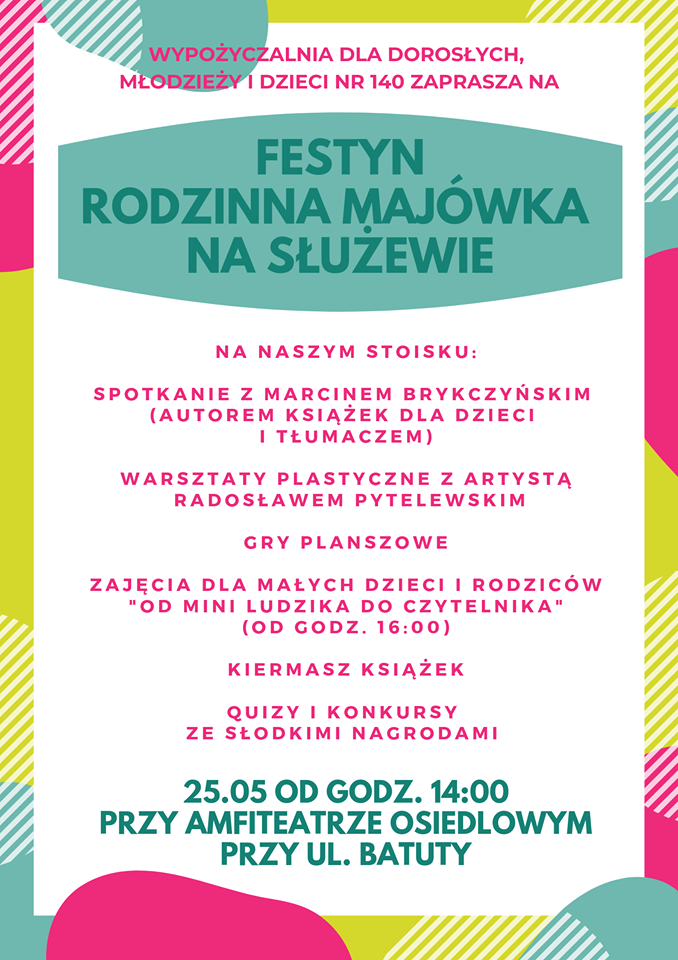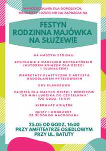 Serdecznie zapraszamy na nasze biblioteczne stoisko na festynie ”Rodzinna majówka na Służewie”, przy amfiteatrze osiedlowym na ul. Batuty.