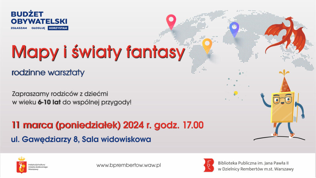Zapraszamy dzieci w wieku 6-10 lat wraz z rodzicami, na kreatywne warsztaty tworzenia map i opowieści fantasy. Wydarzenie odbędzie się w Bibliotece przy ul. Gawędziarzy 8tw poniedziałek 11 marca o godz. 17:00, a poprowadzi je Kamila Zalewska-Firus – autorka gier fabularnych dla dzieci, mieszkanka Rembertowa.