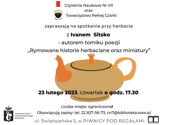 23 lutego o godzinie 17:30 cykl rozpocznie spotkanie autorskie z Ivanem Sitsko – pasjonatem herbaty oraz twórcą tomiku poezji „Rymowane historie herbaciane oraz miniatury”. Będzie okazja, by spróbować wysokiej jakości herbaty parzonej przez Ivana oraz innych członków społeczności herbacianej z Towarzystwa Pełnej Czarki, posłuchać wierszy o herbacie autorstwa Ivana Sitsko, wspólnie napisać miniaturę na wzór haiku, a także porozmawiać o herbacie i tematach z nią związanych.