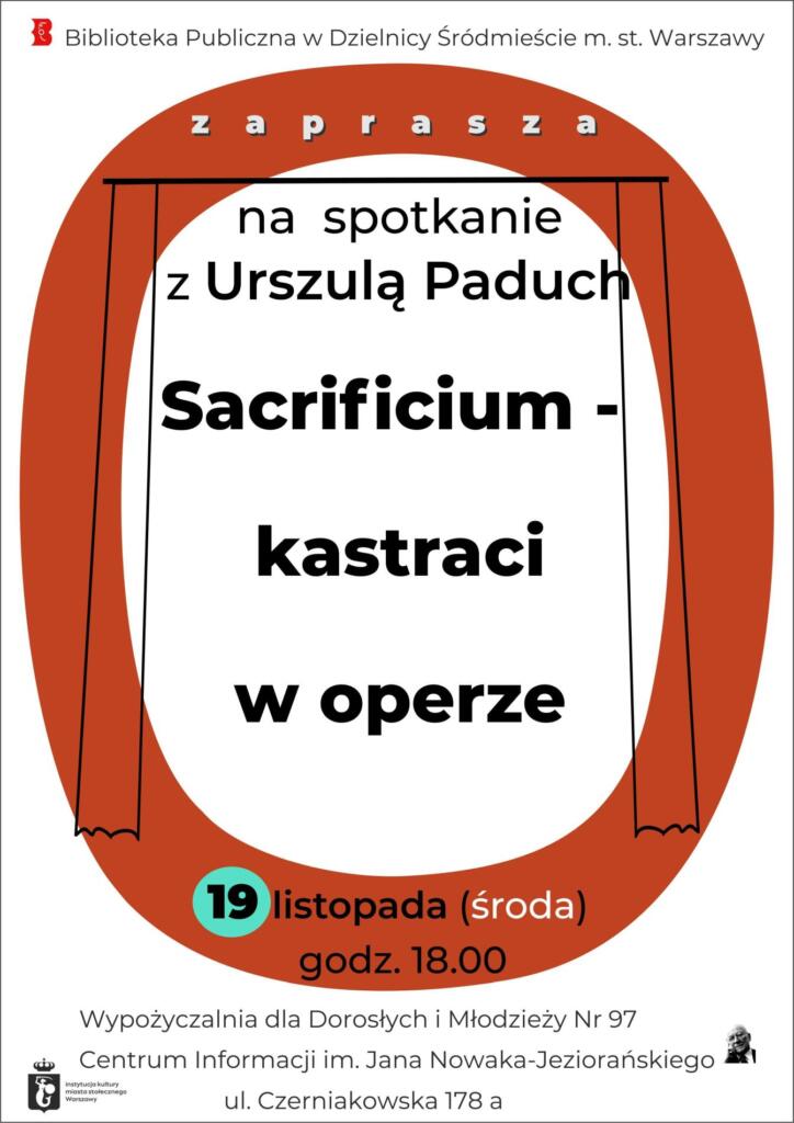 Biblioteka Publiczna w Dzielnicy Śródmieście m.st. Warszawy zaprasza na spotkanie z Urszulą Paduch pt. „Sacrificium – kastraci w operze”.