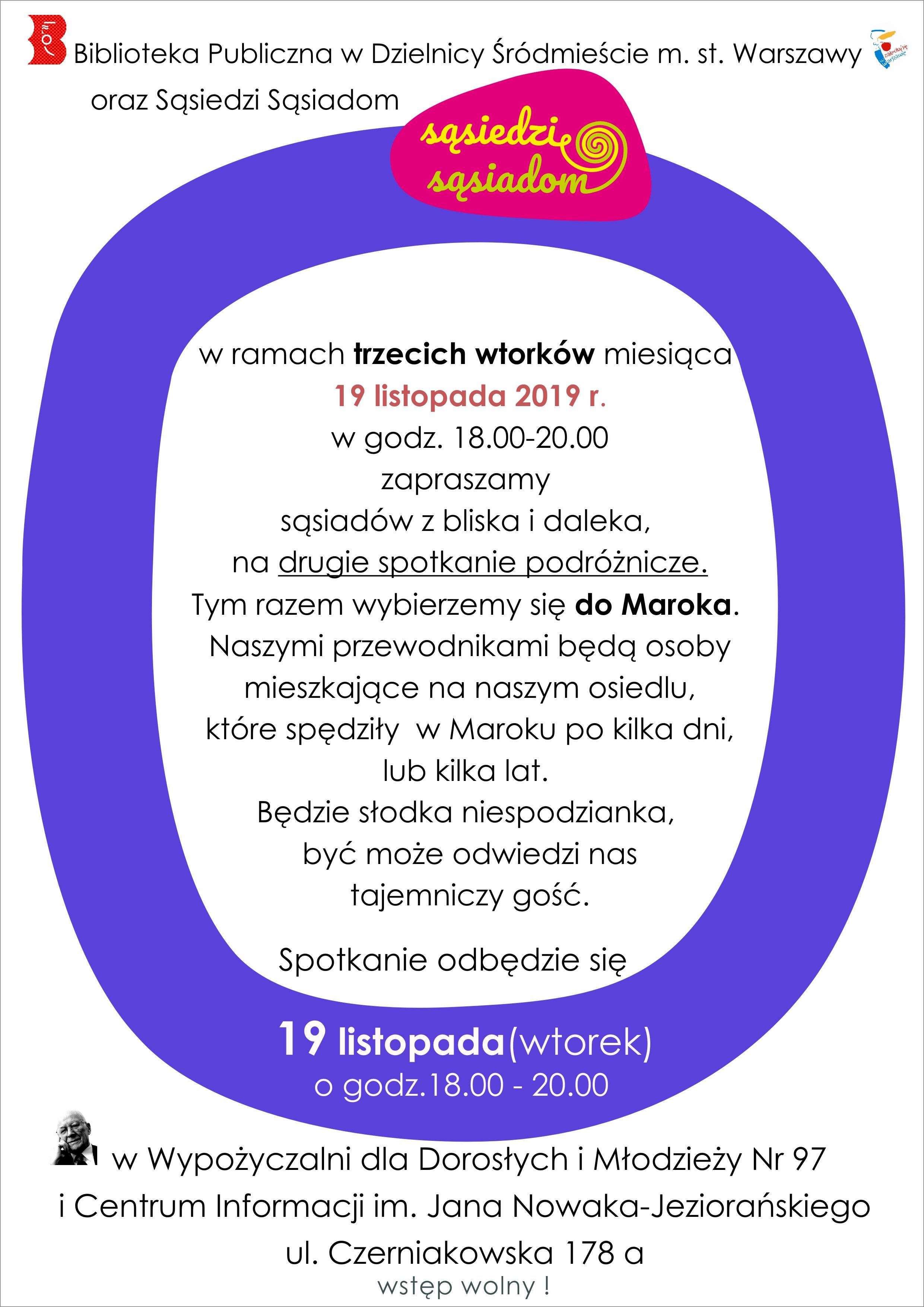 Zapraszamy we wtorek 19 listopada o godzinie 18:00 do Wypożyczalni dla Dorosłych i Młodzieży nr 97, przy ulicy Czerniakowskiej 178A na spotkanie sąsiedzkiej sieci wsparcia na Solcu i Powiślu. Zapraszamy sąsiadów z bliska i daleka na drugie spotkanie podróżnicze. Tym razem wybierzemy się do Maroka. Naszymi przewodnikami będą osoby mieszkające na naszym osiedlu, które spędziły w Maroku po kilka dni, lub kilka lat.