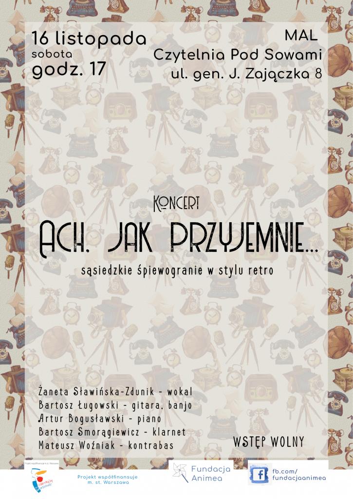Zapraszamy na koncert „Ach, jak przyjemnie…” – sąsiedzkie śpiewogranie w stylu retro. Będzie to jeden z dwóch koncertów, realizowanych w ramach zadania publicznego pt. Sąsiedzkie śpiewogrania w żoliborskich MAL-ach, współfinansowanego przez Urząd Dzielnicy Żoliborz.