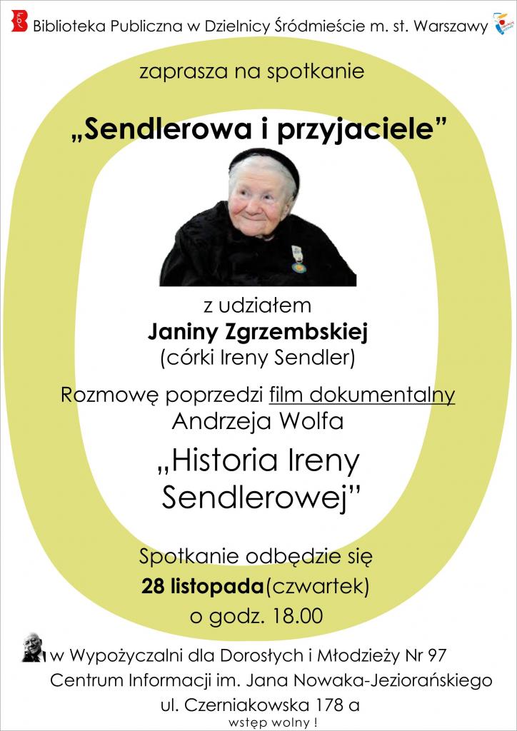 Biblioteka Publiczna w Dzielnicy Śródmieście m.st. Warszawy zaprasza w czwartek 28 listopada o godzinie 18:00, do Wypożyczalni dla Dorosłych i Młodzieży nr 97 przy ulicy Czerniakowskiej 178A na spotkanie „Sendlerowa i przyjaciele” z udziałem Janiny Zgrzembskiej (córki Ireny Sendler). Rozmowę poprzedzi film dokumentalny Andrzeja Wolfa „Historia Ireny Sendlerowej”.
