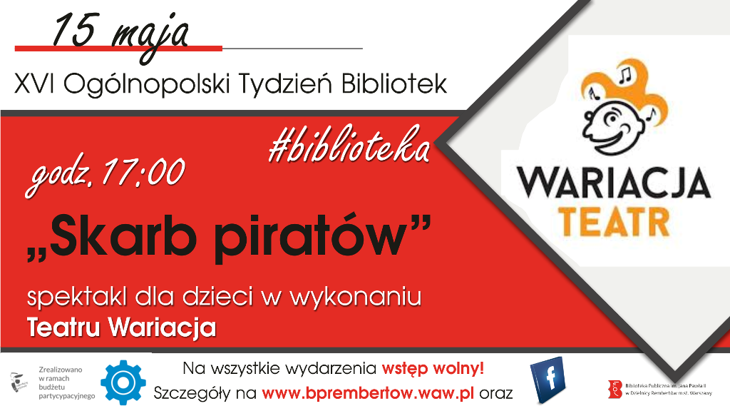 Z okazji Tygodnia Bibliotek serdecznie zapraszamy wszystkie dzieci na przedstawienie teatralne w wykonaniu Teatru Wariacja pt.„Skarb piratów”, które odbędzie się 15 maja w środę o godzinie 17:00, w Bibliotece przy ul. Gawędziarzy 8.