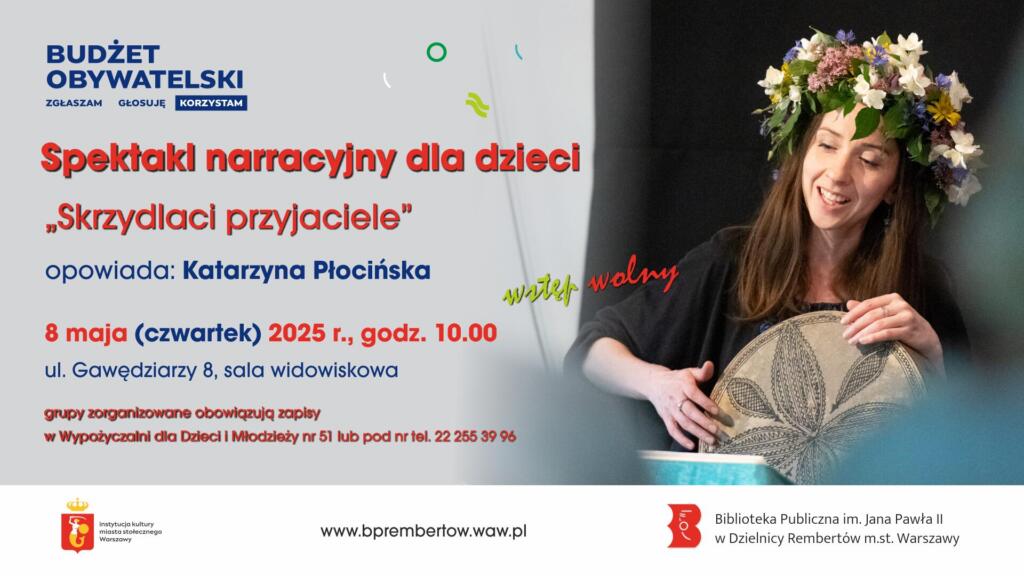 Niezwykłe spotkanie z wyobraźnią i pięknymi opowieściami. Magiczny spektakl narracyjny dla dzieci pt. „Skrzydlaci przyjaciele” w wykonaniu opowiadaczki Katarzyny Płocińskiej-Betuli, odbędzie się 8 maja o godzinie 10:00 w Bibliotece przy ul. Gawędziarzy 8.