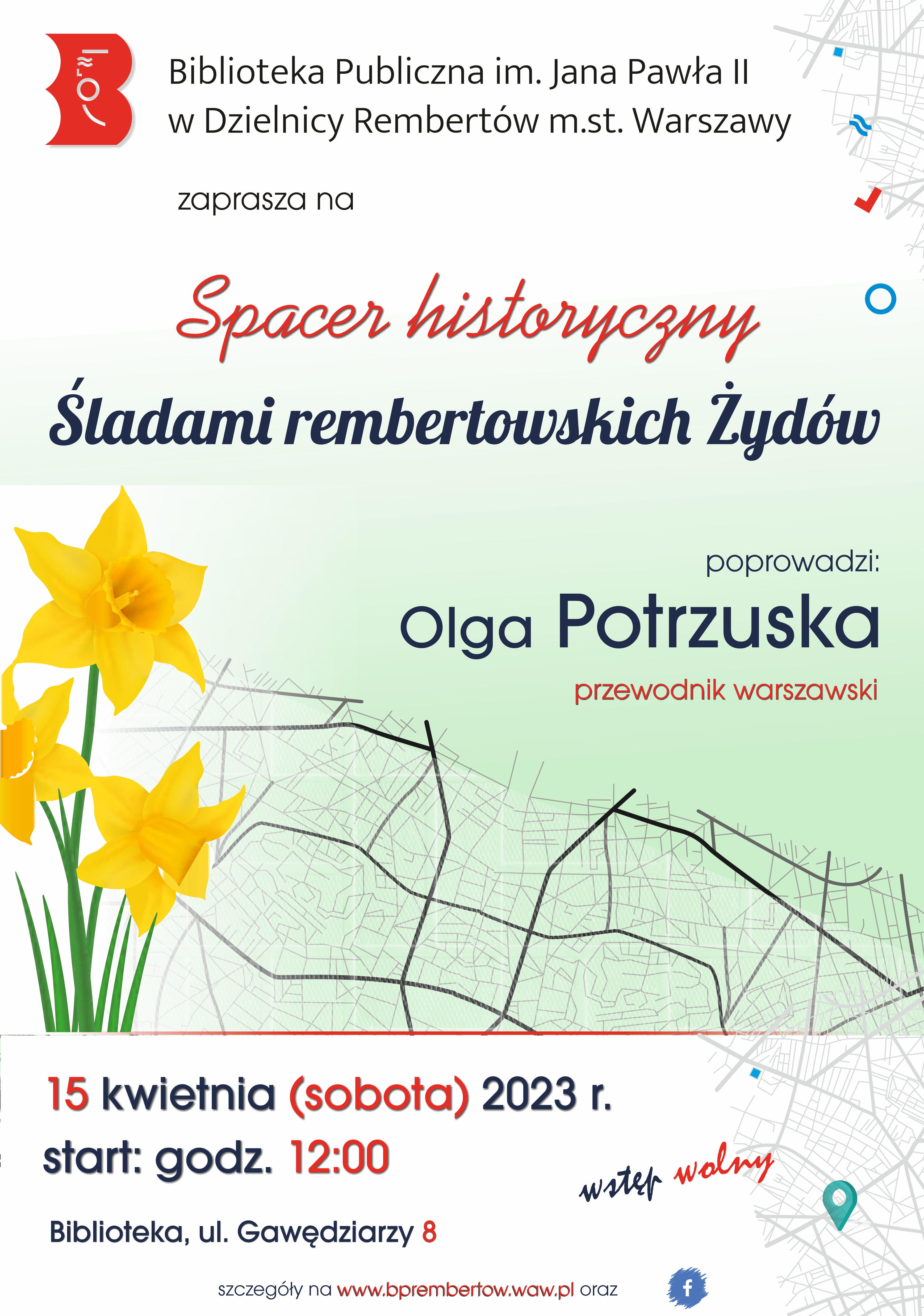 Przewodnik warszawski Olga Potrzuska poprowadzi kwietniowy spacer „Śladami rembertowskich Żydów”. Grupa spacerowiczów wyruszy 15 kwietnia o godz. 12:00 spod biblioteki przy ul. Gawędziarzy. Zbiórka została zaplanowana o 11:55. Wydarzenie jest organizowane w ramach wolontariatu w bibliotece, jako inauguracja rembertowskich obchodów 80. rocznicy powstania w getcie warszawskim.