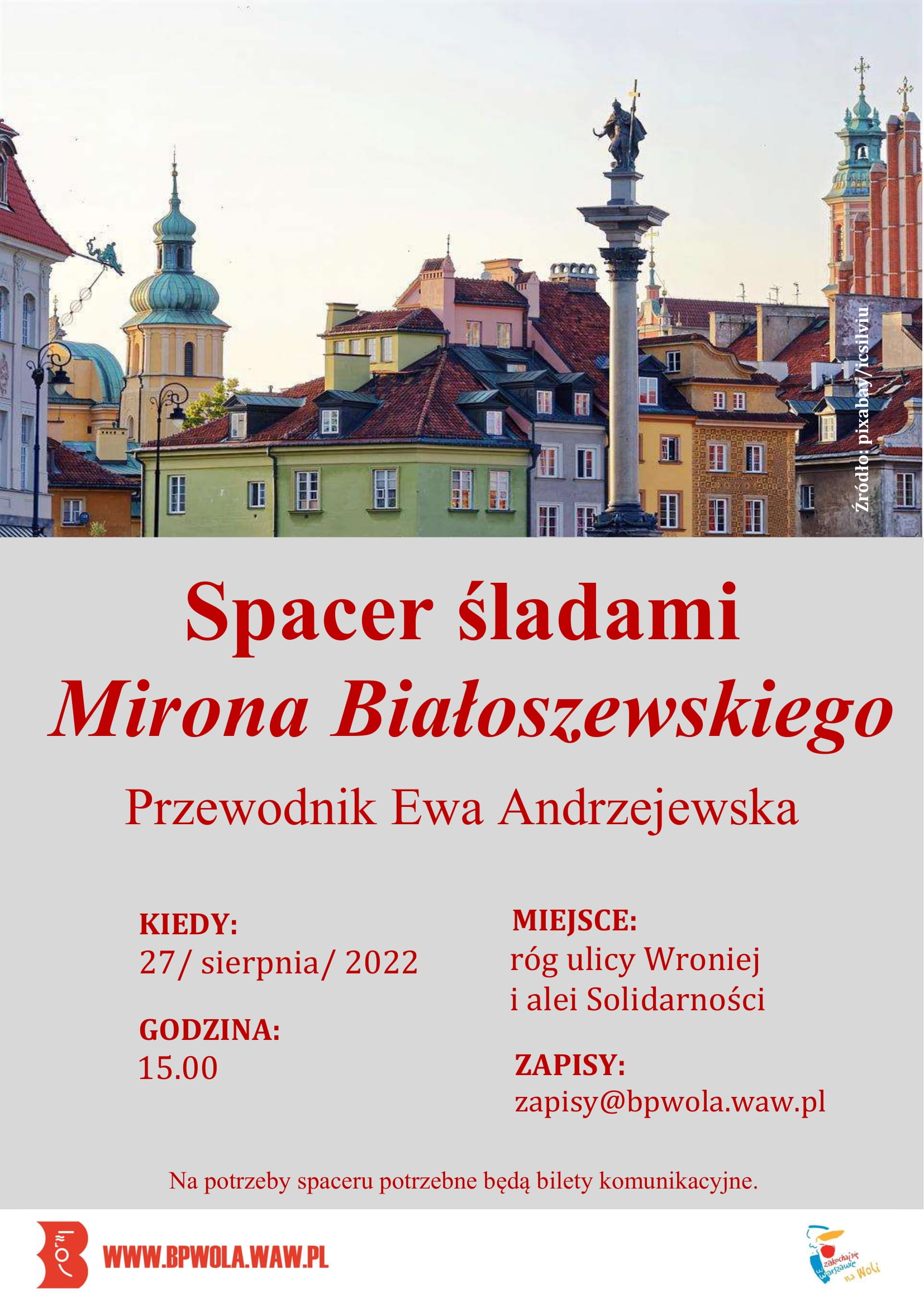 Prosimy o zgłoszenia mailowe na adres: zapisy@bpwola.waw.pl. Na potrzeby spaceru potrzebne będą bilety komunikacji miejskiej.
