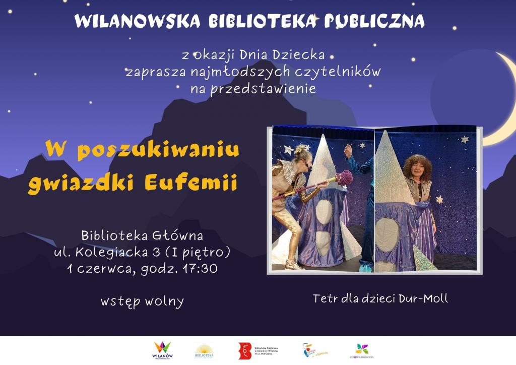 Pewnego dnia z nieba znika gwiazdka Eufemia. Co się stało? Gdzie się podziała? Dwie dzielne dziewczynki postanawiają rozwikłać tę zagadkę. W czasie podróży dziewczynki przeżyją wiele przygód i przekonają się, jak widzą Ziemię mieszkańcy kosmosu. Na pełną humoru galaktyczną podróż zapraszamy w środę 1 czerwca o godz. 17:30.