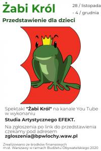 Już dziś zapraszamy do obejrzenia wyjątkowego spektaklu zatytułowanego „Żabi Król” w wykonaniu Studio Artystyczne Efekt.