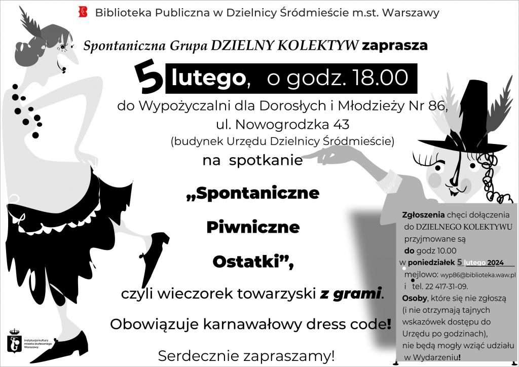 Zgłoszenia chęci dołączenia do DZIELNEGO KOLEKTYWU przyjmowane są telefonicznie: 22 417-31-09 i mejlowo: wyp86@biblioteka.waw.pl do godziny 10:00 w poniedziałek 5 lutego. Osoby, które się nie zgłoszą (i nie otrzymają tajnych wskazówek dostępu do Urzędu po godzinach), nie będą mogły wziąć udziału w Wydarzeniu!